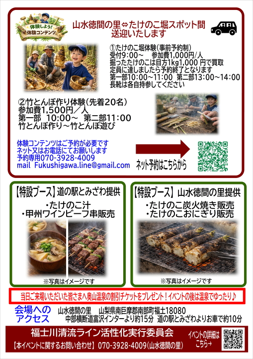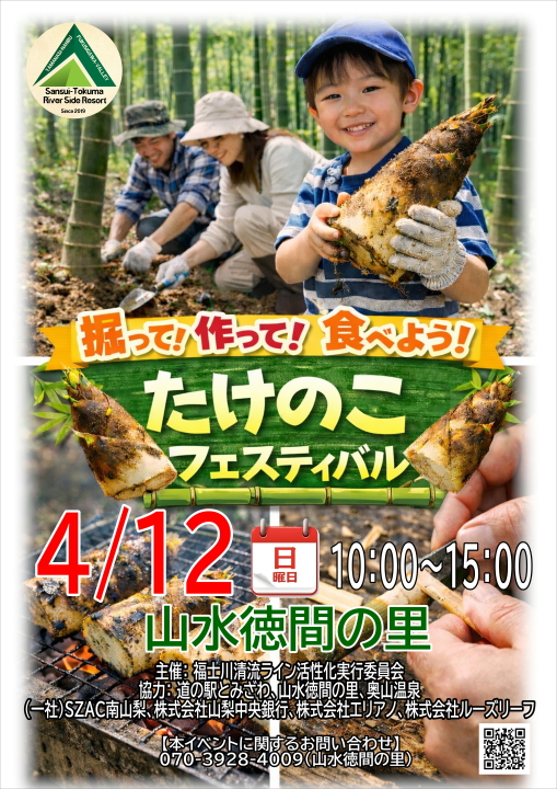 福士川清流ライン主催 掘って!作って!食べよう!たけのこフェスティバルを山水徳間の里で開催します。